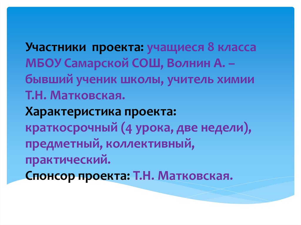 Участники проекта: учащиеся 8 классаМБОУ Самарской СОШ, Волнин А. –