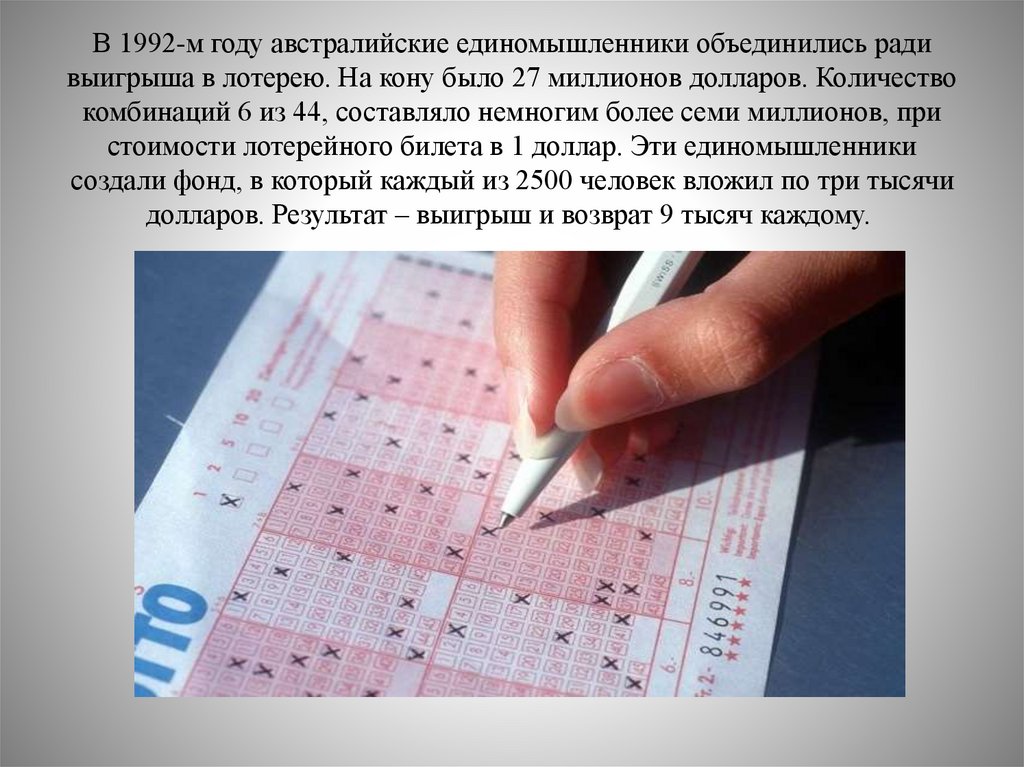 В 1992-м году австралийские единомышленники объединились радивыигрыша в лотерею. На кону было 27 миллионов долларов. Количество