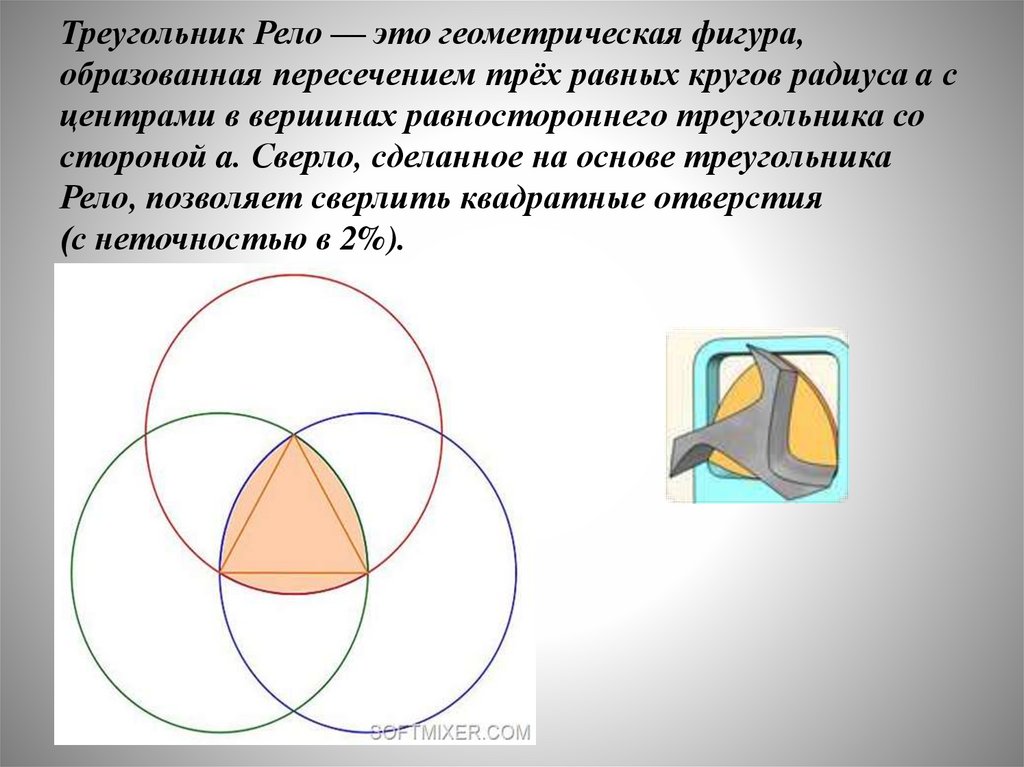 Треугольник Рело — это геометрическая фигура,образованная пересечением трёх равных кругов радиуса a с