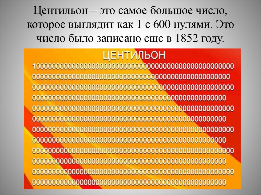 Центильон – это самое большое число,которое выглядит как 1 с 600 нулями. Это