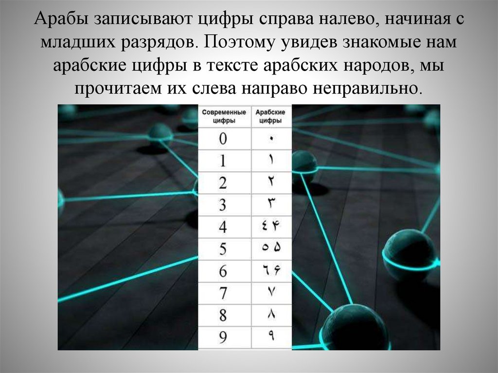 Арабы записывают цифры справа налево, начиная смладших разрядов. Поэтому увидев знакомые нам