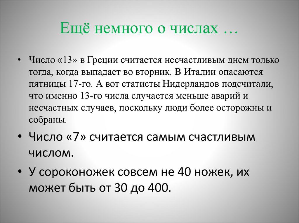 Ещё немного о числах …• Число «13» в Греции считается несчастливым днем только
