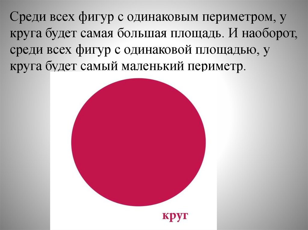 Среди всех фигур с одинаковым периметром, укруга будет самая большая площадь. И наоборот,