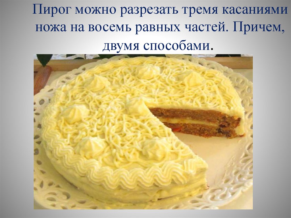 Пирог можно разрезать тремя касанияминожа на восемь равных частей. Причем,