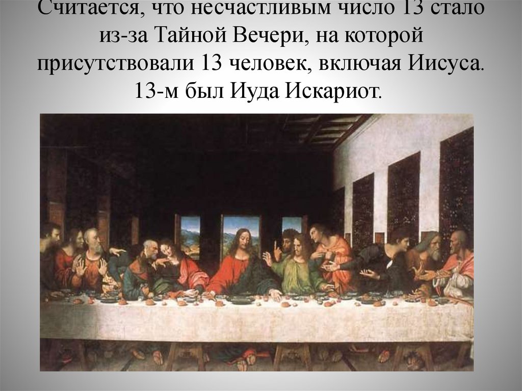 Считается, что несчастливым число 13 сталоиз-за Тайной Вечери, на которой