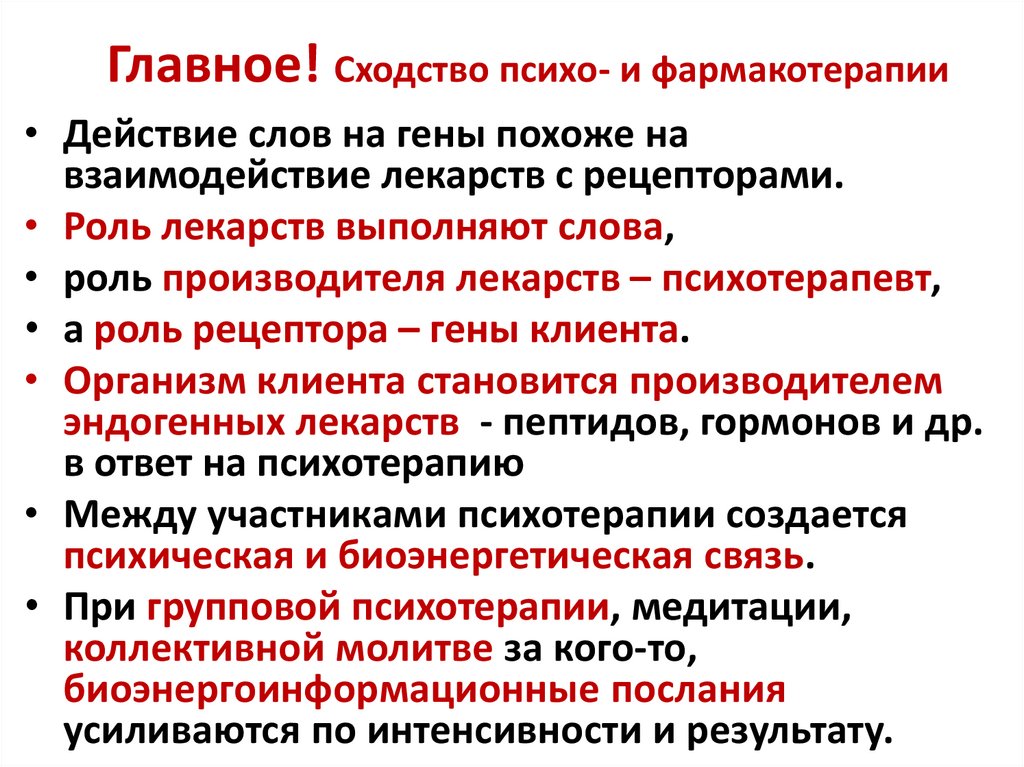 Главное! Сходство психо- и фармакотерапии• Действие слов на гены похоже на