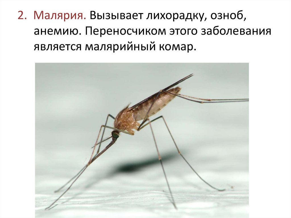 2. Малярия. Вызывает лихорадку, озноб,анемию. Переносчиком этого заболевания