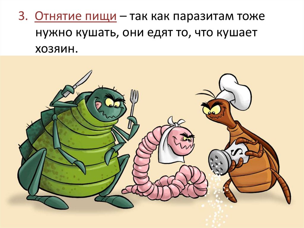 3. Отнятие пищи – так как паразитам тоженужно кушать, они едят то, что кушает