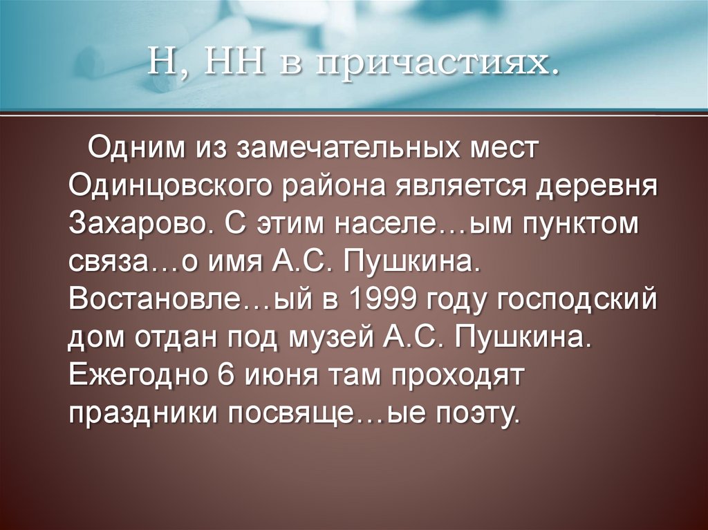 Н, НН в причастиях.Одним из замечательных мест