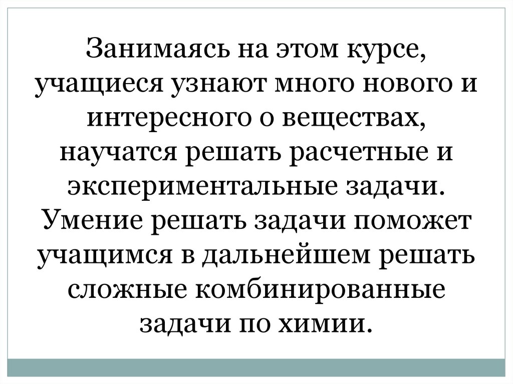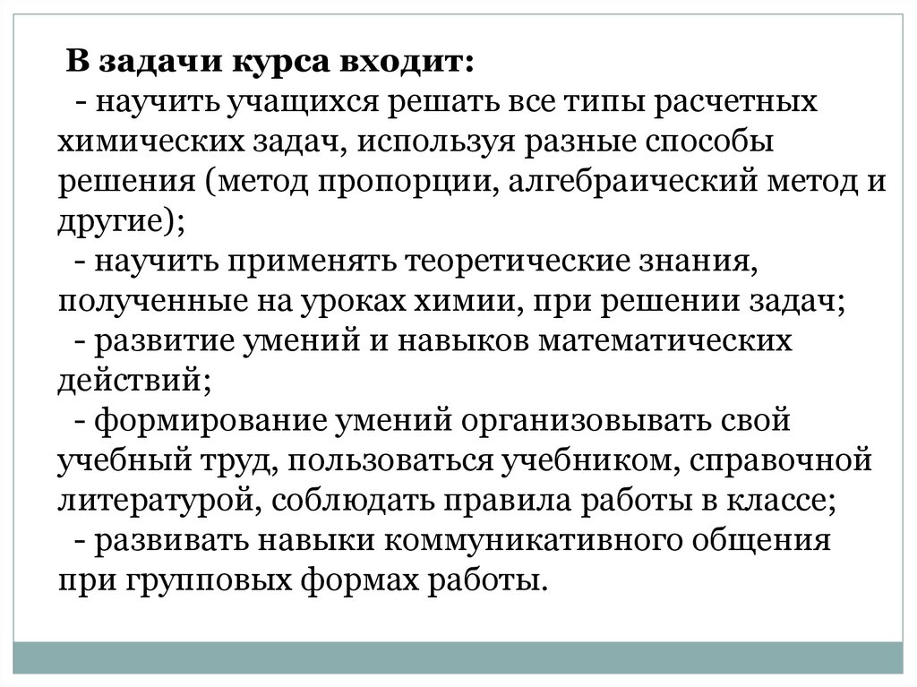 В задачи курса входит:- научить учащихся решать все типы расчетных