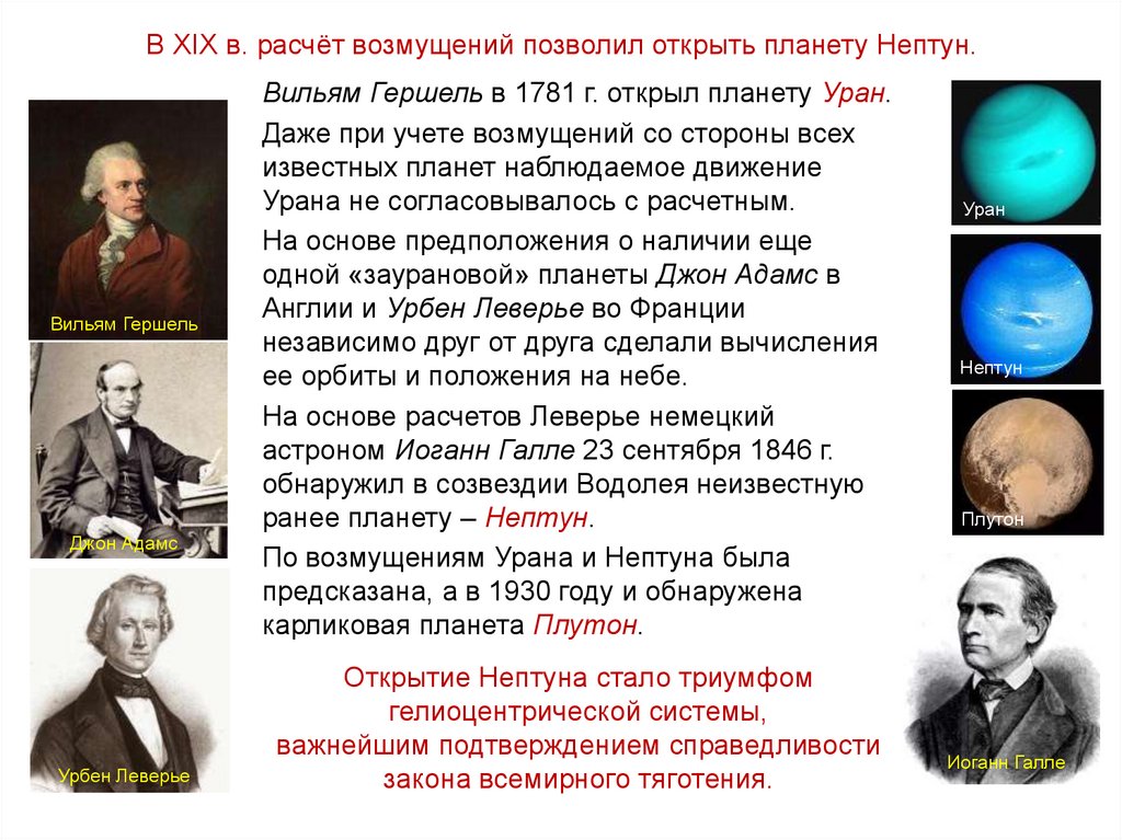 В XIX в. расчёт возмущений позволил открыть планету Нептун.Вильям Гершель