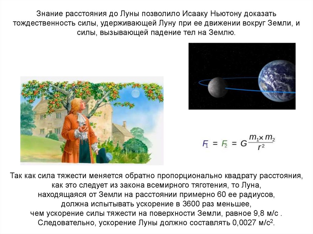 Знание расстояния до Луны позволило Исааку Ньютону доказатьтождественность силы, удерживающей Луну при ее движении вокруг Земли, и