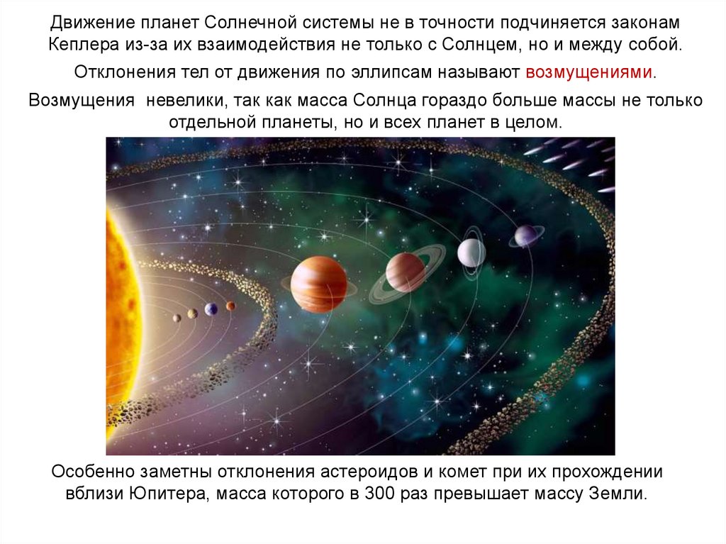 Движение планет Солнечной системы не в точности подчиняется законамКеплера из-за их взаимодействия не только с Солнцем, но и между собой.
