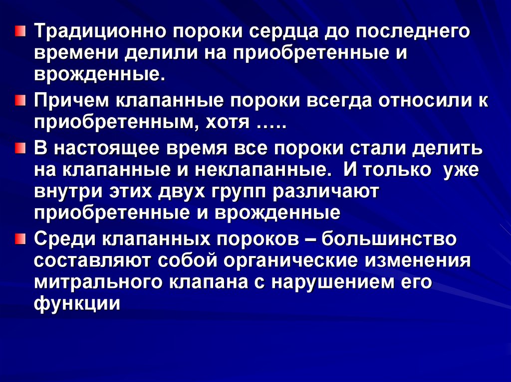 Традиционно пороки сердца до последнеговремени делили на приобретенные и