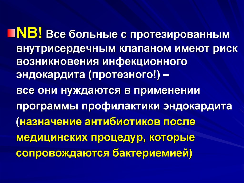 NB! Все больные с протезированнымвнутрисердечным клапаном имеют риск