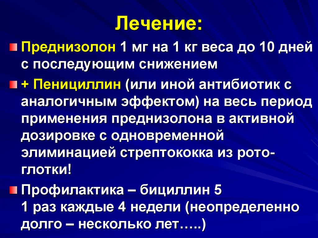 Лечение:Преднизолон 1 мг на 1 кг веса до 10 дней