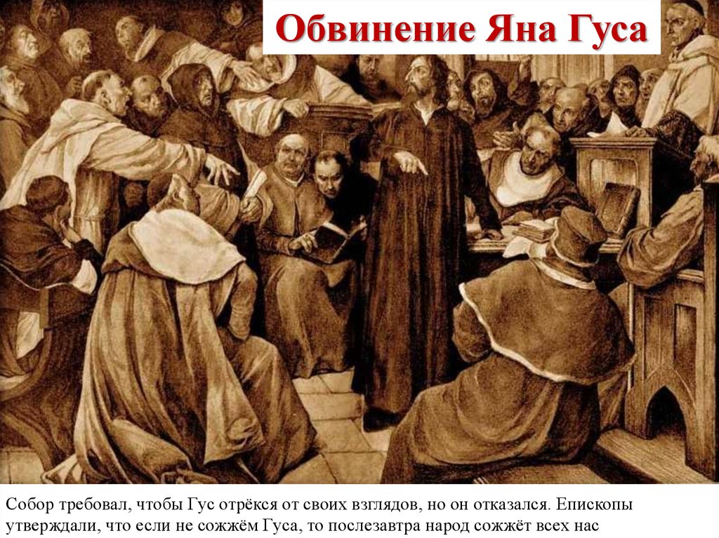 Обвинение Яна ГусаСобор требовал, чтобы Гус отрёкся от своих взглядов, но он отказался. Епископы