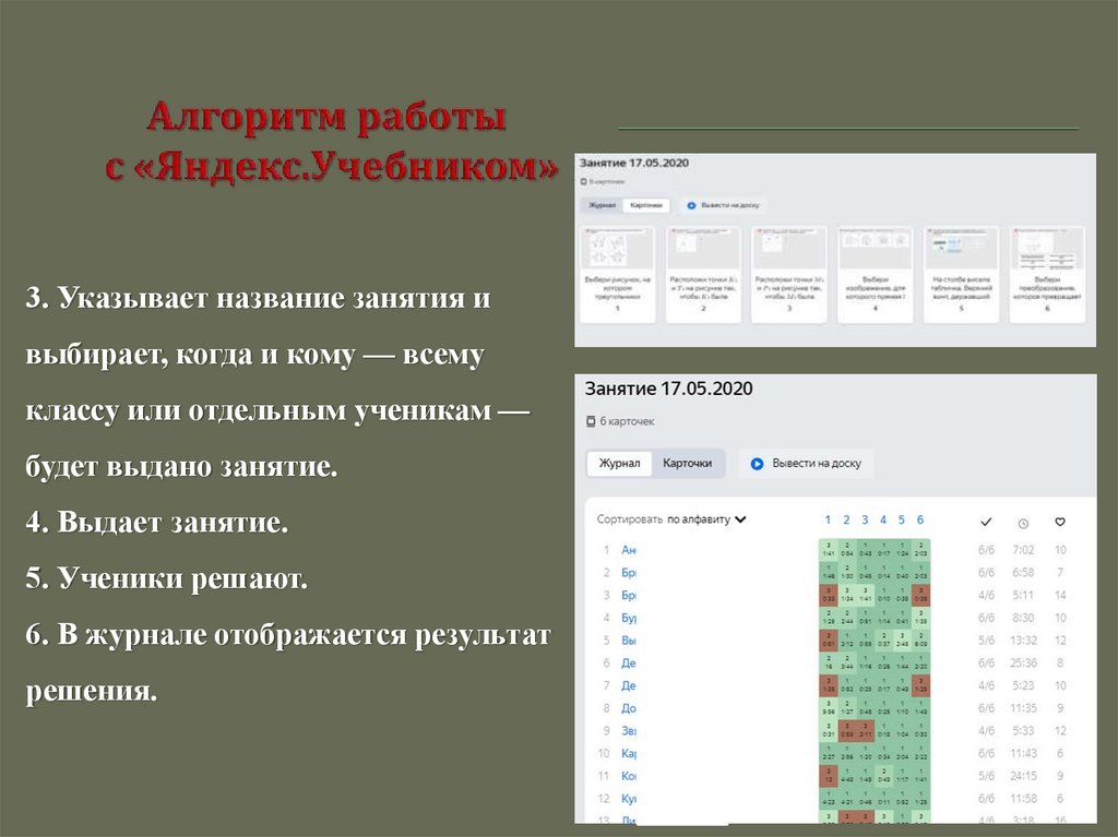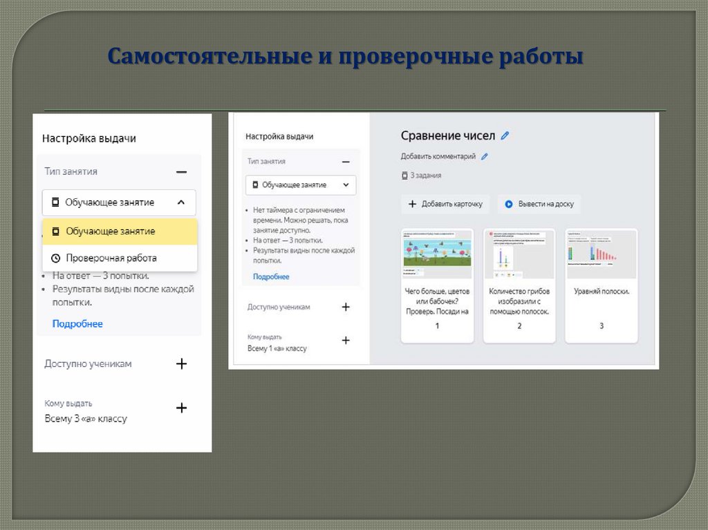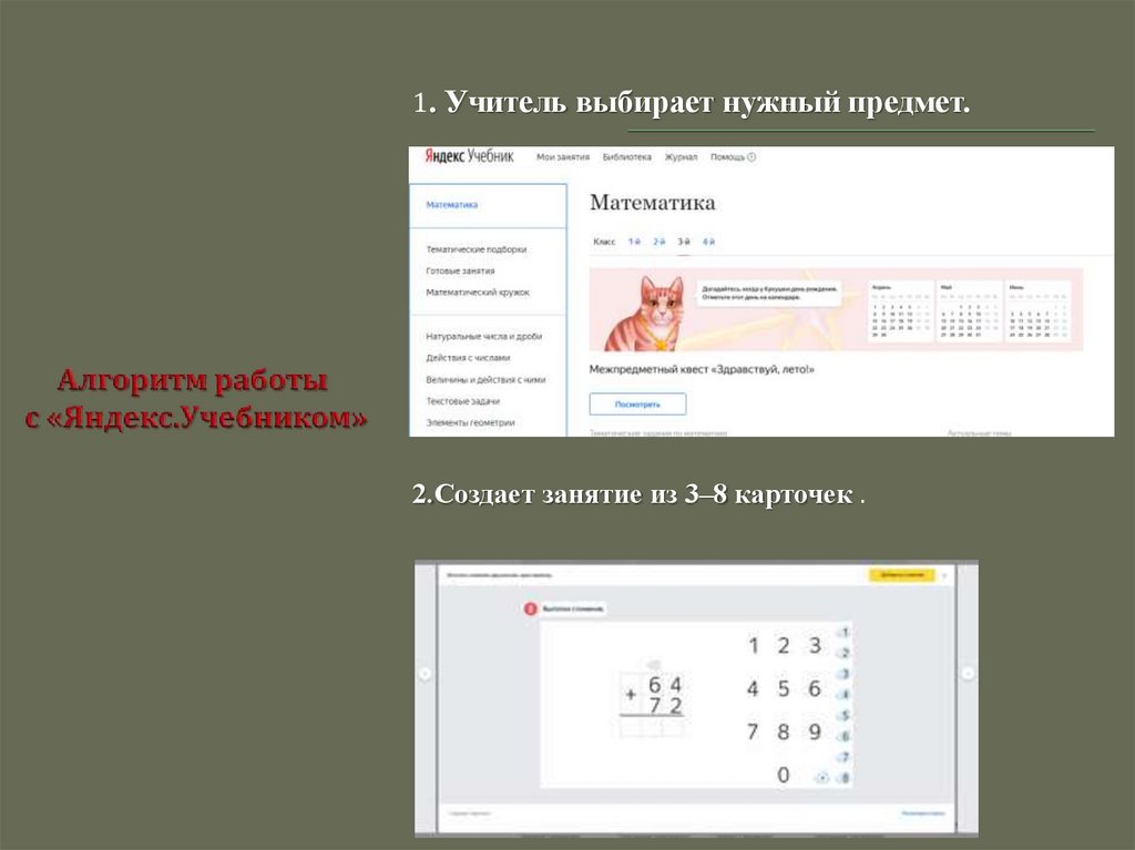 1. Учитель выбирает нужный предмет.2.Создает занятие из 3–8 карточек .