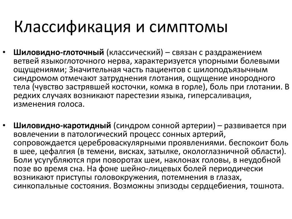 Классификация и симптомы• Шиловидно-глоточный (классический) – связан с раздражением
