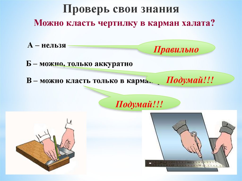 Проверь свои знанияМожно класть чертилку в карман халата?