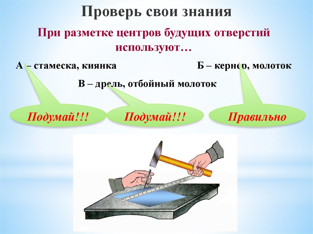Проверь свои знанияПри разметке центров будущих отверстий