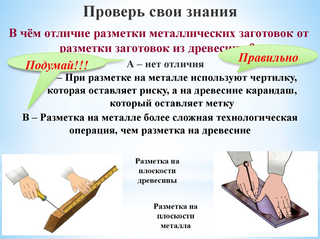 Проверь свои знанияВ чём отличие разметки металлических заготовок от