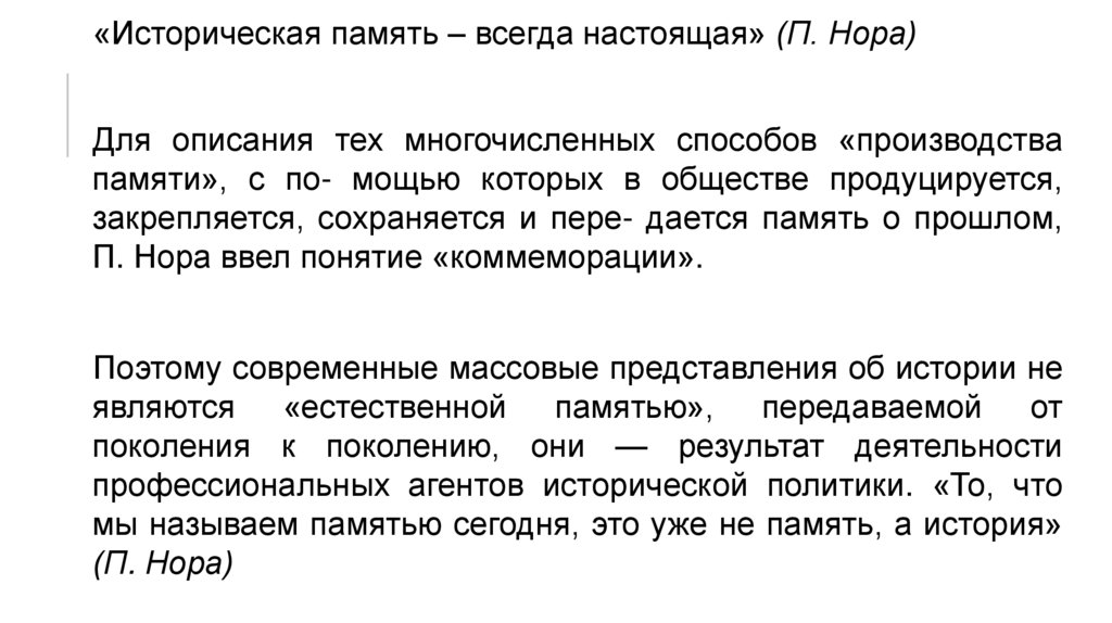 «Историческая память – всегда настоящая» (П. Нора)Для описания тех многочисленных способов «производства