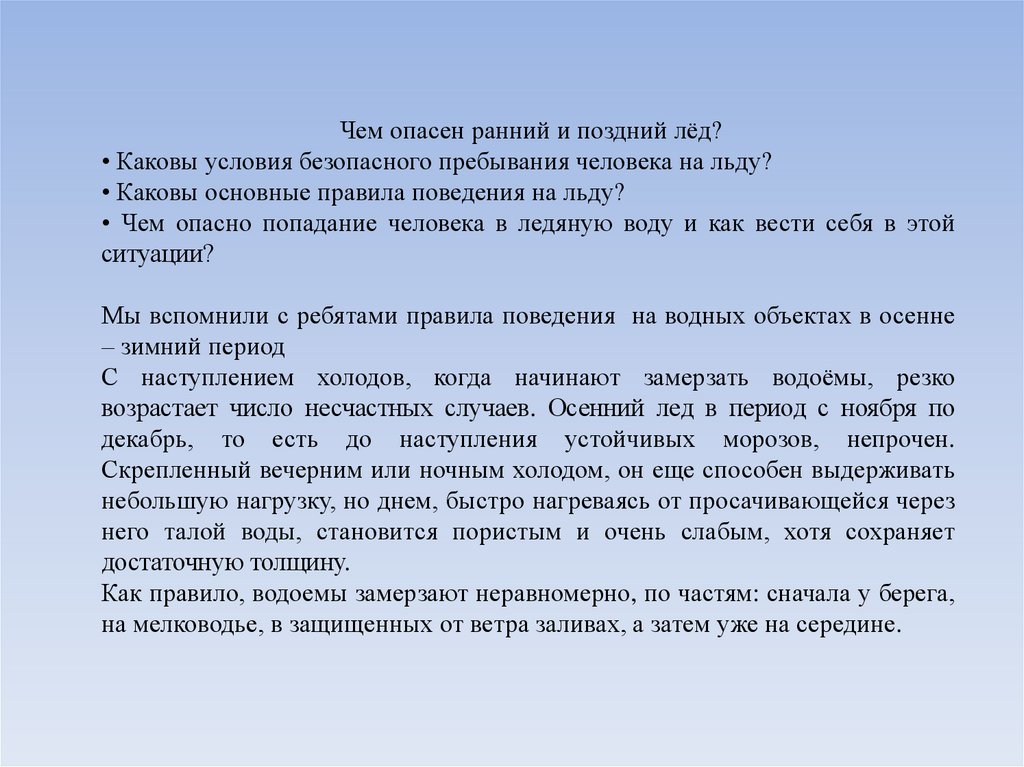 Чем опасен ранний и поздний лёд?• Каковы условия безопасного пребывания человека на льду?