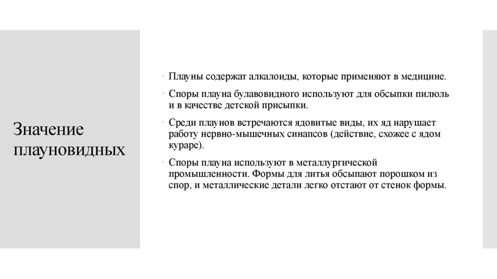 Плауны содержат алкалоиды, которые применяют в медицине.Споры плауна булавовидного используют для обсыпки пилюль