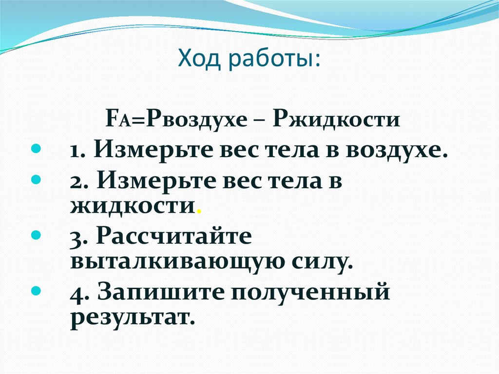 Ход работы:FA=Pвоздухе – Pжидкости