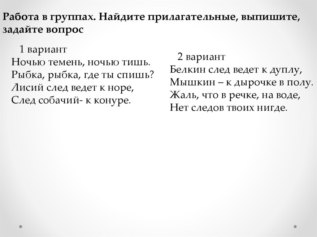 Работа в группах. Найдите прилагательные, выпишите,задайте вопрос