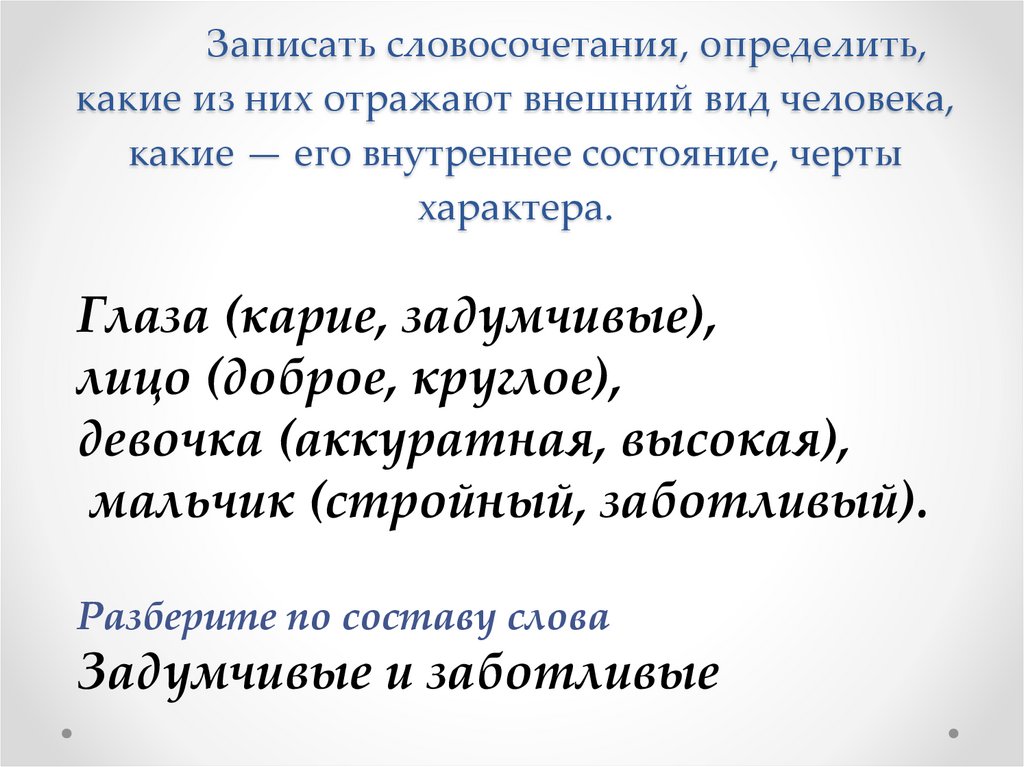Записать словосочетания, определить,какие из них отражают внешний вид человека,