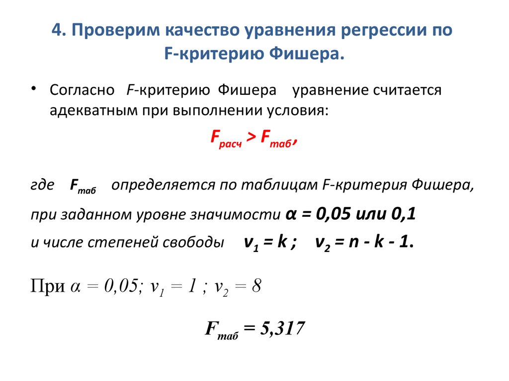 4. Проверим качество уравнения регрессии поF-критерию Фишера.