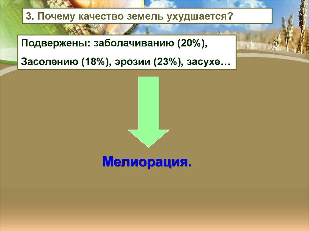 3. Почему качество земель ухудшается?Подвержены: заболачиванию (20%),