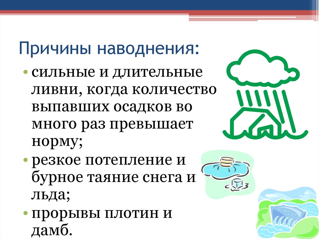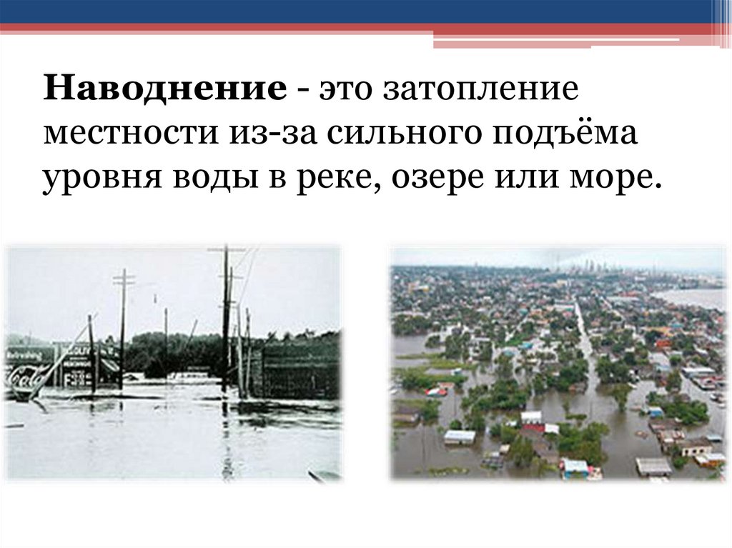Наводнение - это затоплениеместности из-за сильного подъёма