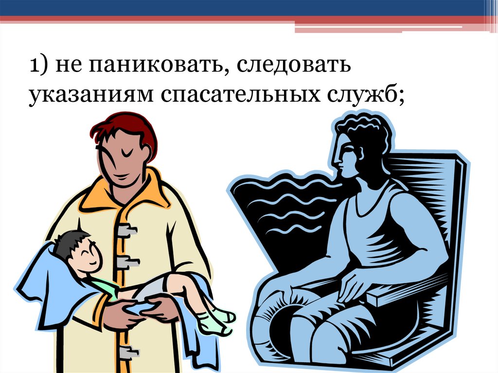 1) не паниковать, следоватьуказаниям спасательных служб;