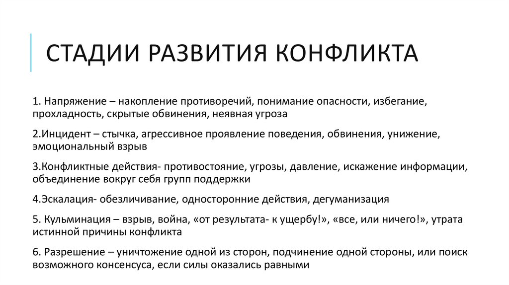 СТАДИИ РАЗВИТИЯ КОНФЛИКТА1. Напряжение – накопление противоречий, понимание опасности, избегание,