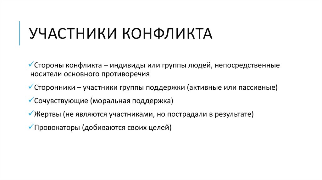 УЧАСТНИКИ КОНФЛИКТАСтороны конфликта – индивиды или группы людей, непосредственные