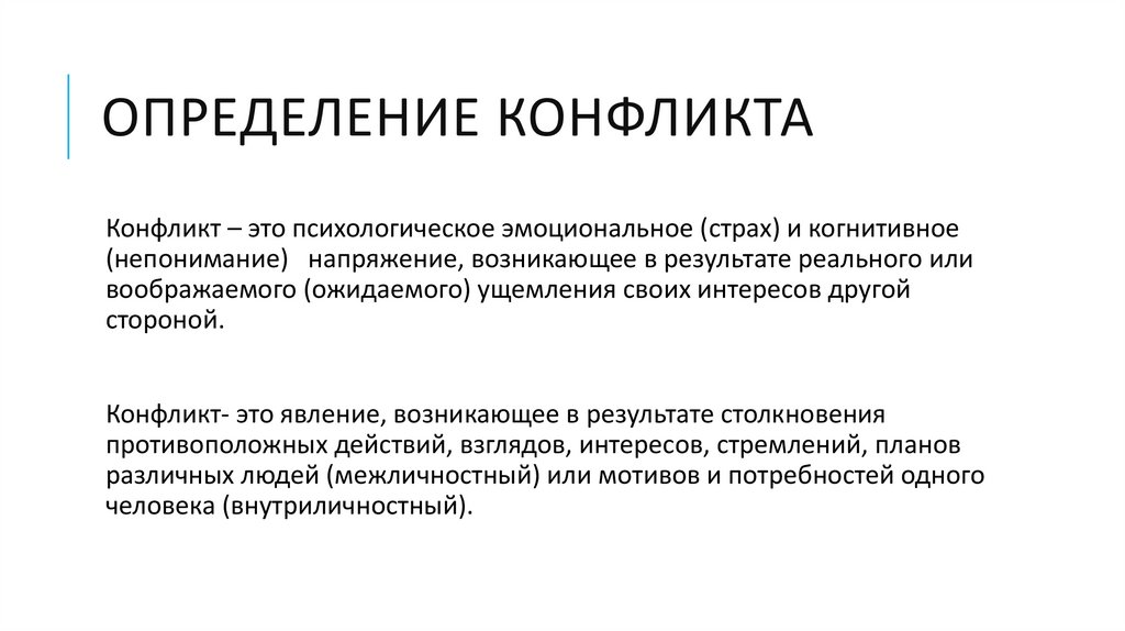ОПРЕДЕЛЕНИЕ КОНФЛИКТАКонфликт – это психологическое эмоциональное (страх) и когнитивное
