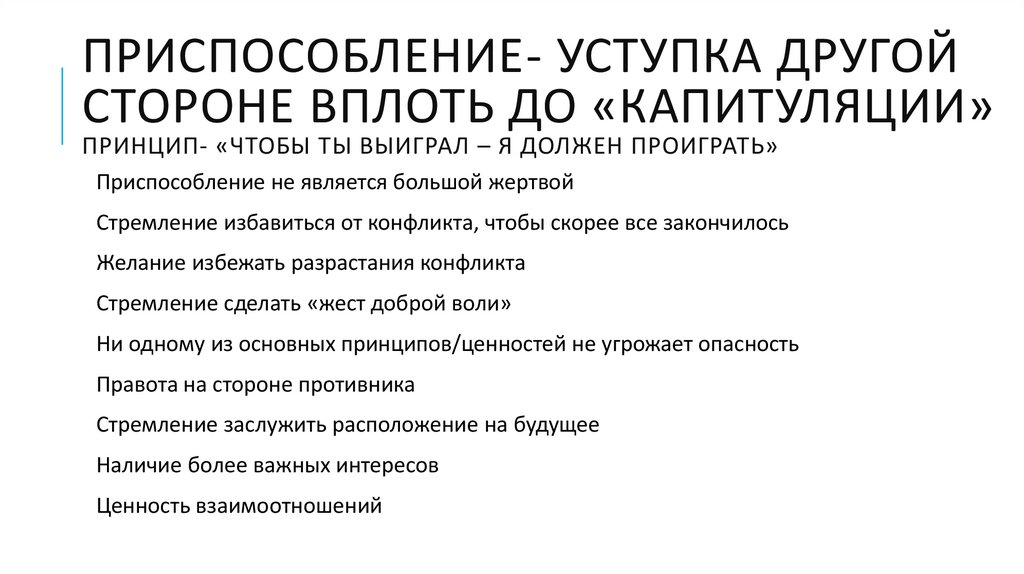 ПРИСПОСОБЛЕНИЕ- УСТУПКА ДРУГОЙСТОРОНЕ ВПЛОТЬ ДО «КАПИТУЛЯЦИИ»