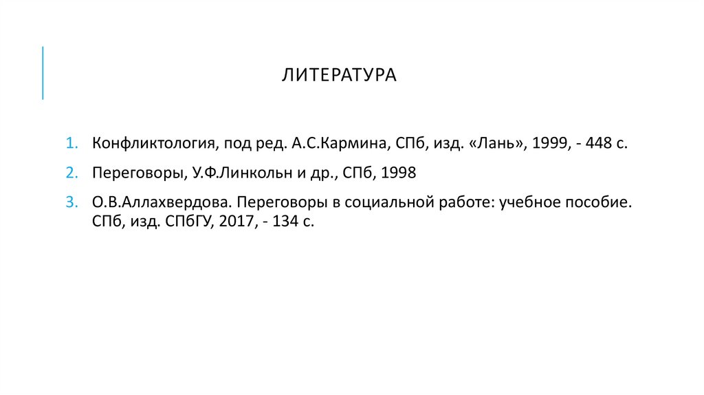 ЛИТЕРАТУРА1. Конфликтология, под ред. А.С.Кармина, СПб, изд. «Лань», 1999, - 448 с.
