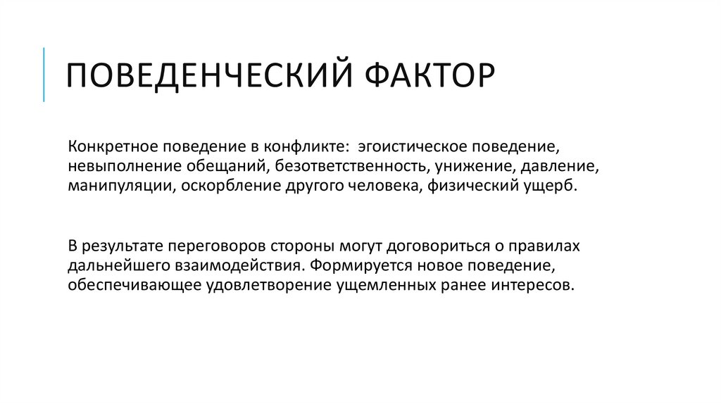 ПОВЕДЕНЧЕСКИЙ ФАКТОРКонкретное поведение в конфликте: эгоистическое поведение,