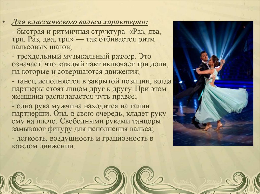 • Для классического вальса характерно:- быстрая и ритмичная структура. «Раз, два,