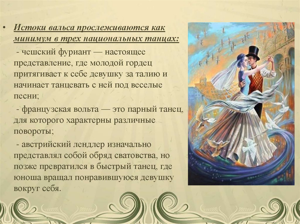 • Истоки вальса прослеживаются какминимум в трех национальных танцах:
