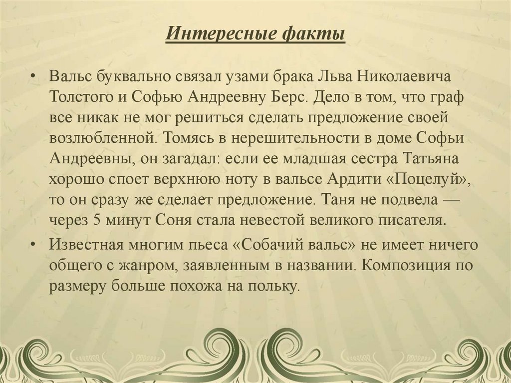 Интересные факты• Вальс буквально связал узами брака Льва Николаевича