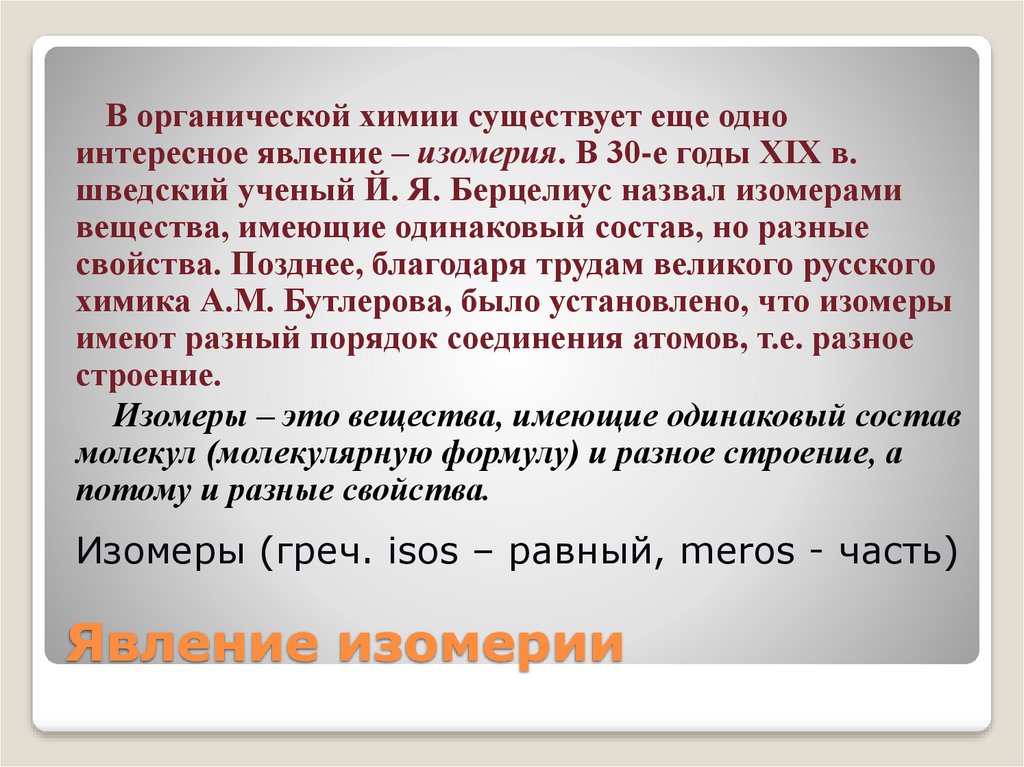 В органической химии существует еще одноинтересное явление – изомерия. В 30-е годы XIX в.