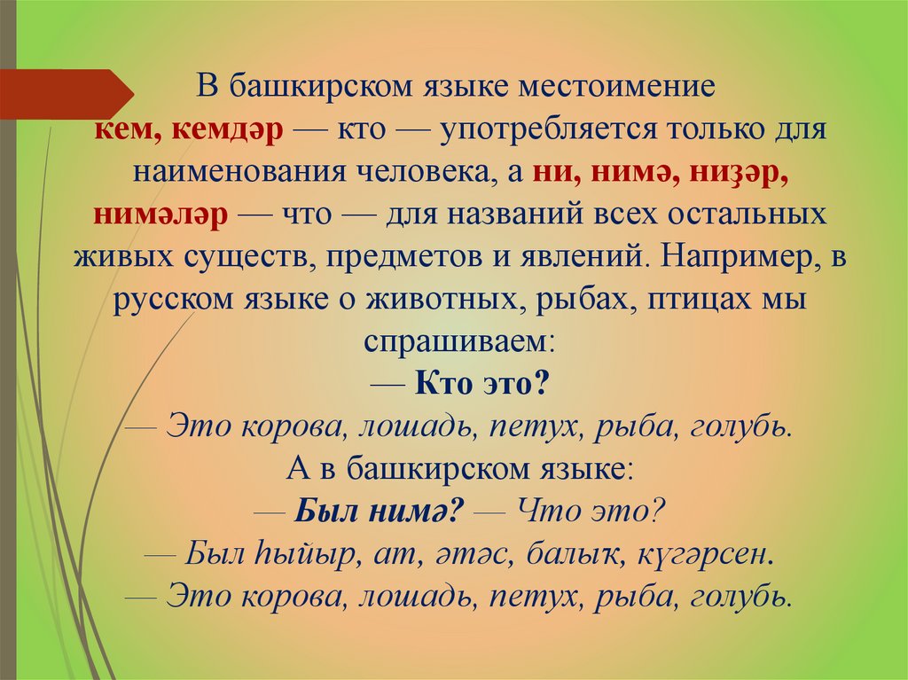 В башкирском языке местоимениекем, кемдәр — кто — употребляется только для