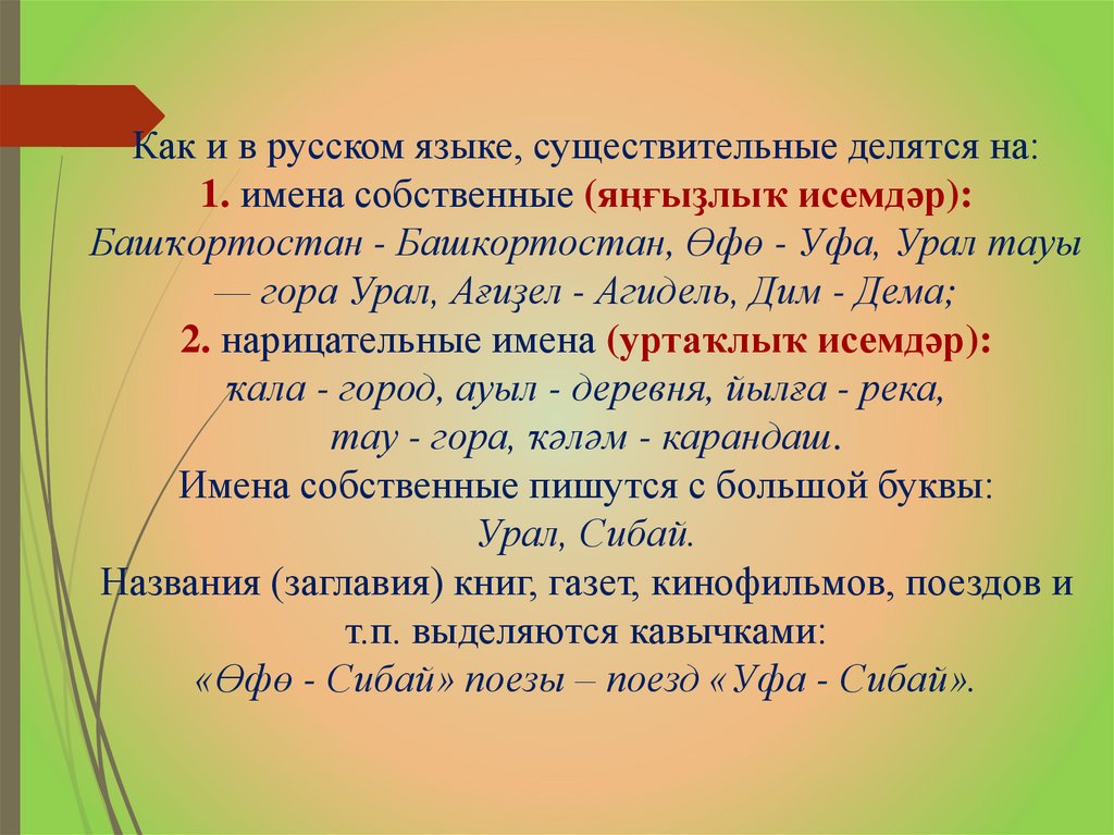 Как и в русском языке, существительные делятся на:1. имена собственные (яңғыҙлыҡ исемдәр):