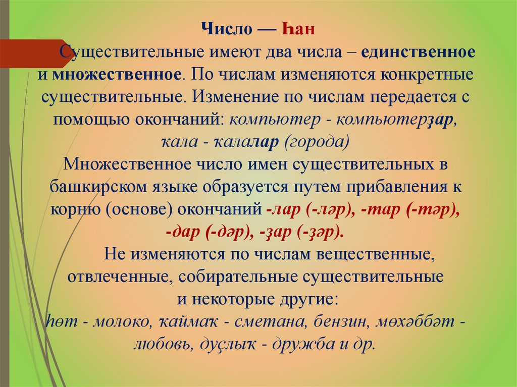 Исемдәрҙең һан менән үҙгәреше(изменение имен существительных по числам)