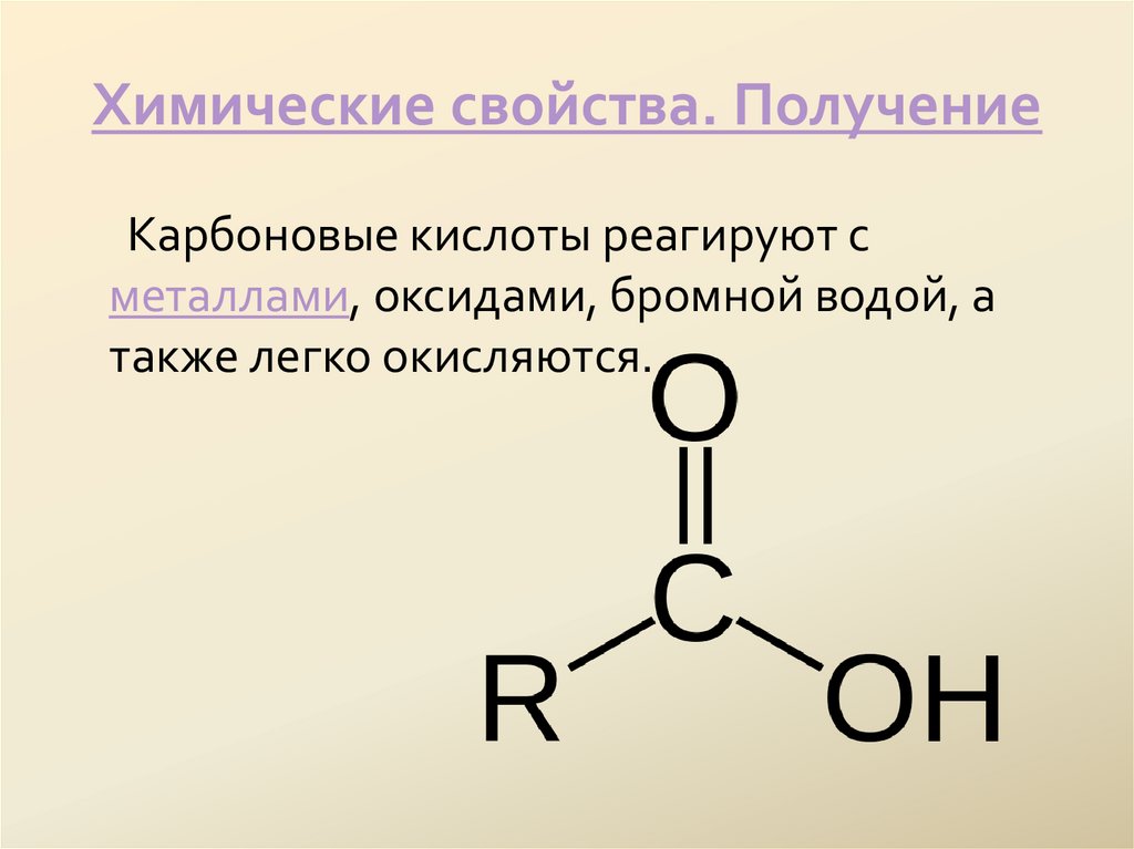 Химические свойства. ПолучениеКарбоновые кислоты реагируют с